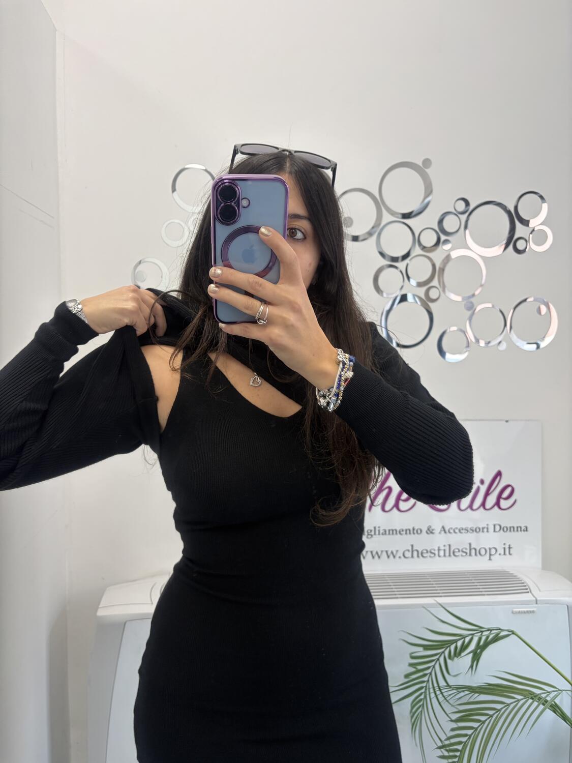 Abito a costine in maglina di viscosa a canotta con coprispalle. Taglia unica, veste dalla 38 alla 44/46. Composizione: 88% viscosa, 12% nylon.