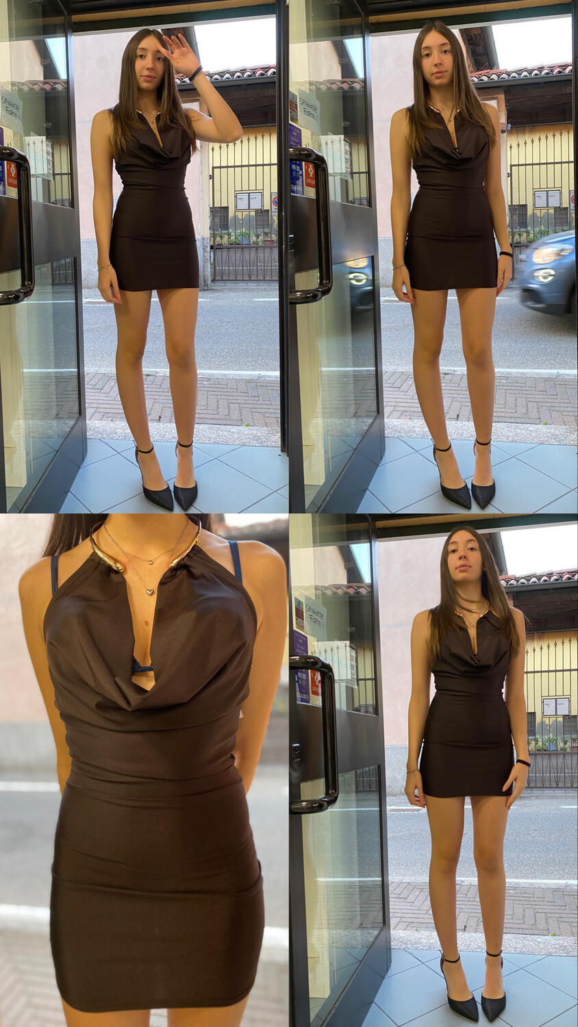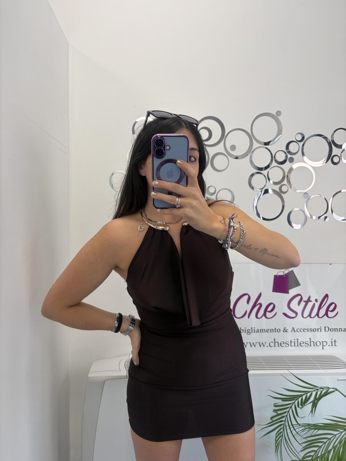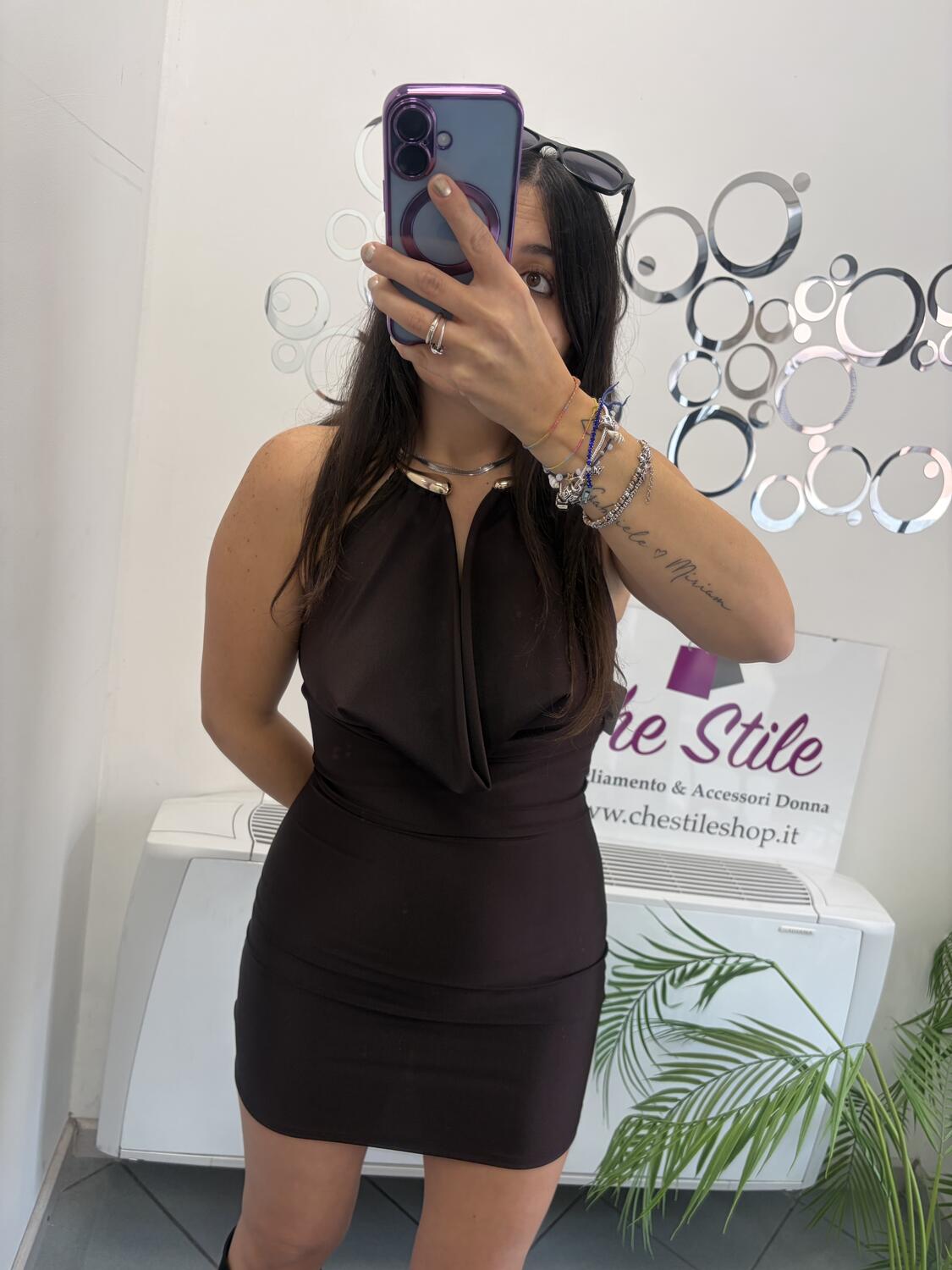 Mini dress con scollo morbido e dettaglio collana dorata integrata. Taglia unica, vestibilità piccola, dalla 36 alla 42. Made in Italy. Composizione: 95% poliestere, 5% elastan.