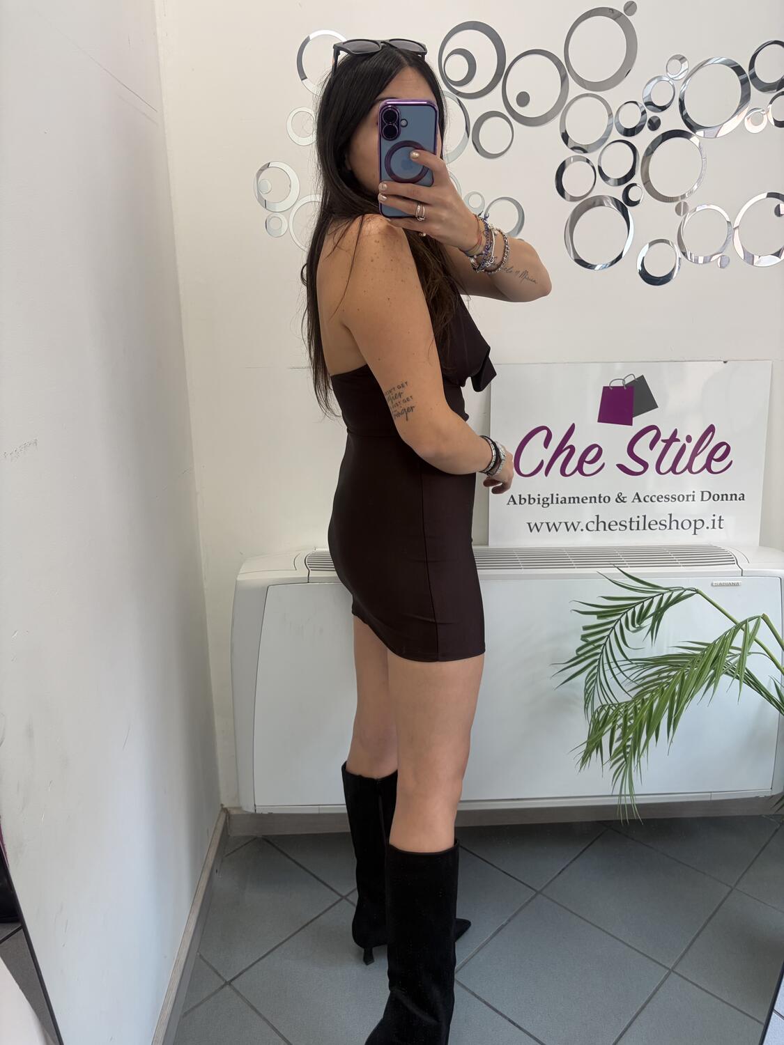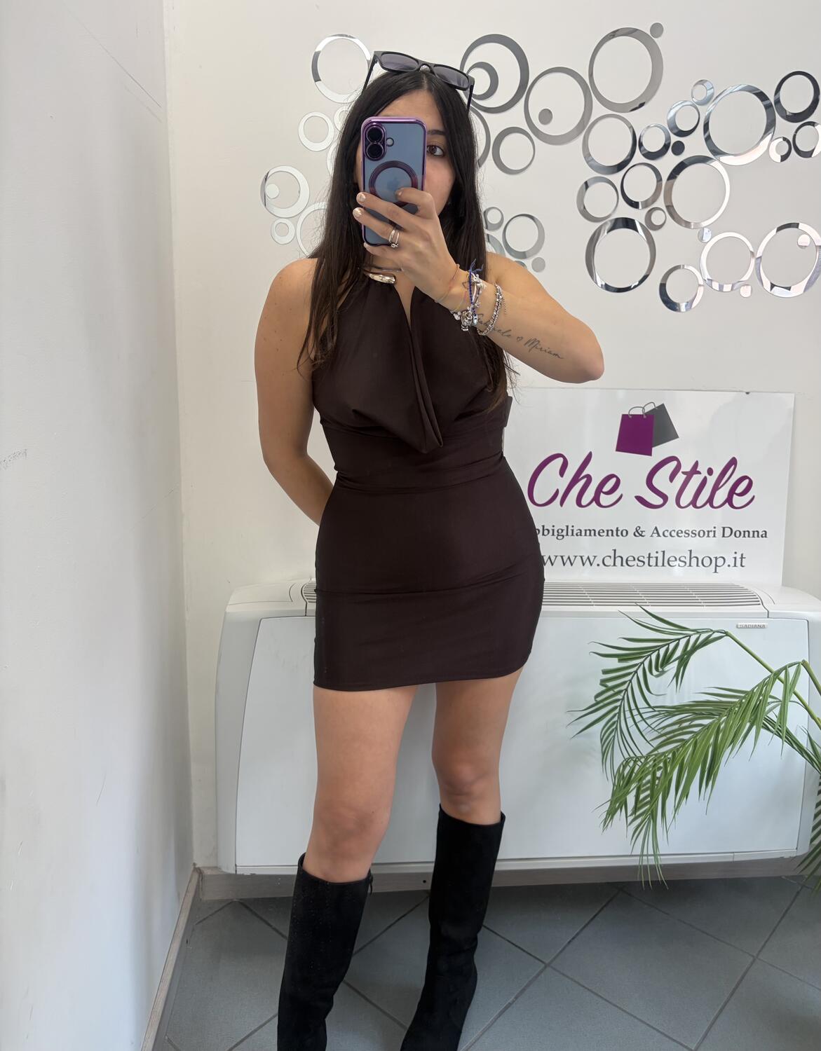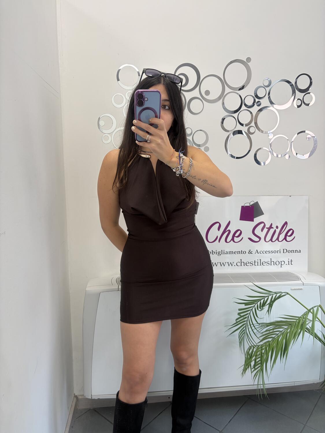 Mini dress con scollo morbido e dettaglio collana dorata integrata. Taglia unica, vestibilità piccola, dalla 36 alla 42. Made in Italy. Composizione: 95% poliestere, 5% elastan.