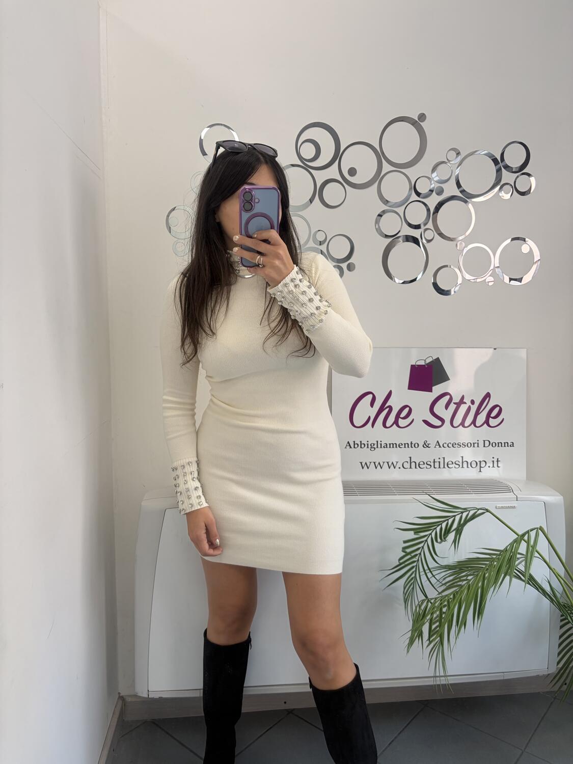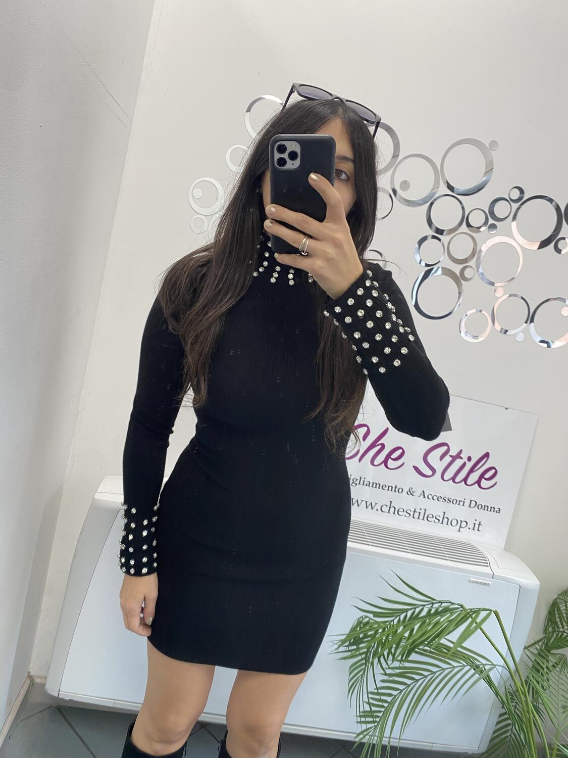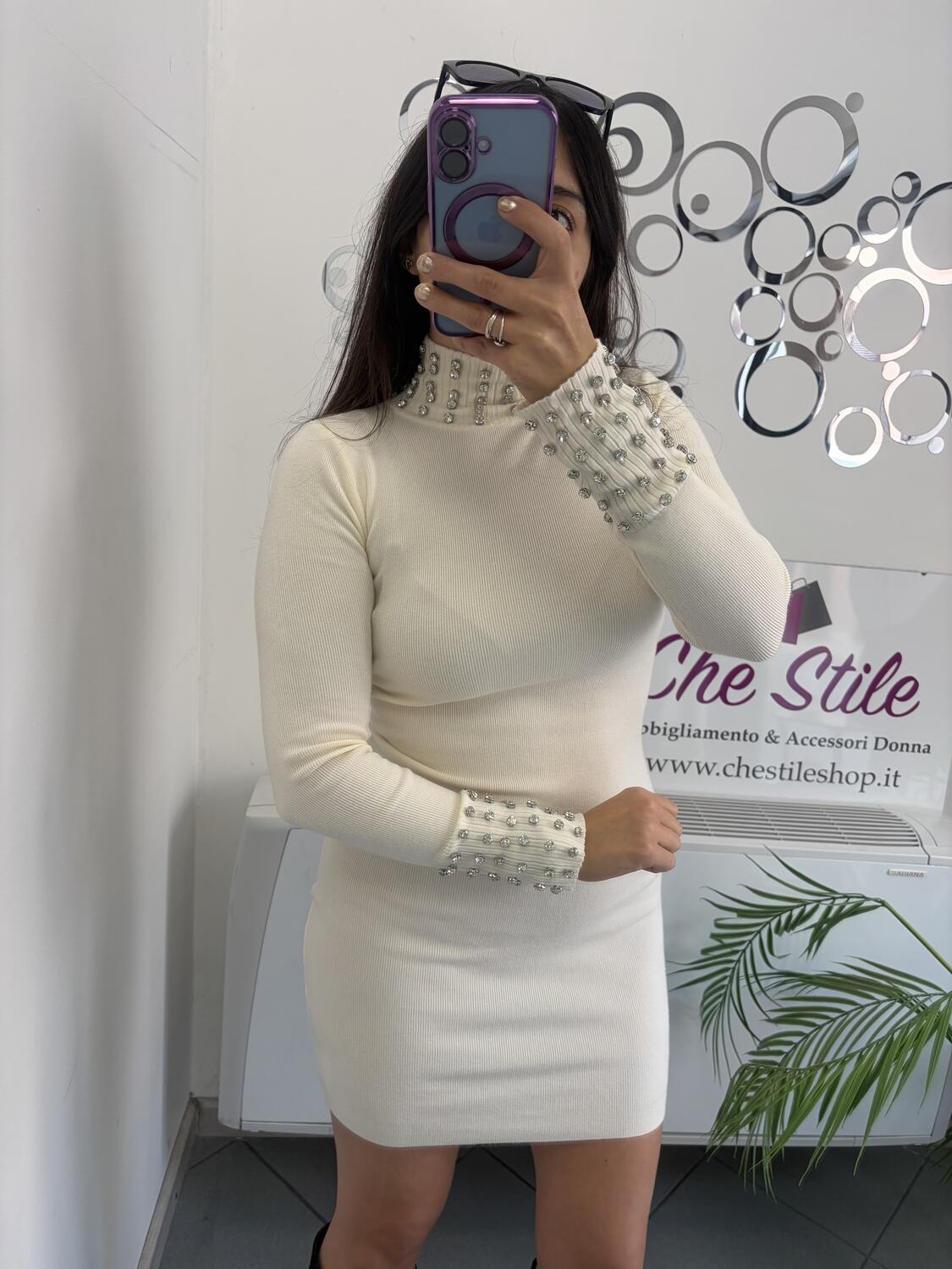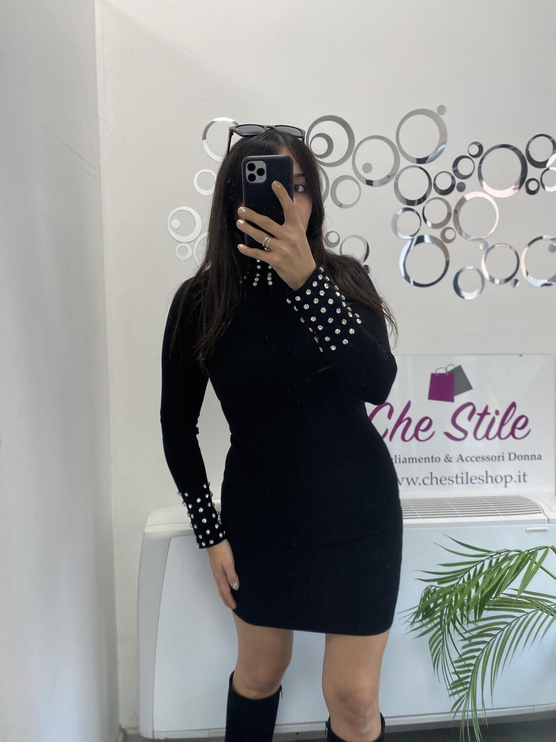 Abito in maglina di viscosa a costine sottili con mezzo collo e dettaglio di strass sui polsi e sul collo. Taglia unica, veste dalla 38 alla 44/46. Composizione: 88% viscosa, 12% nylon.