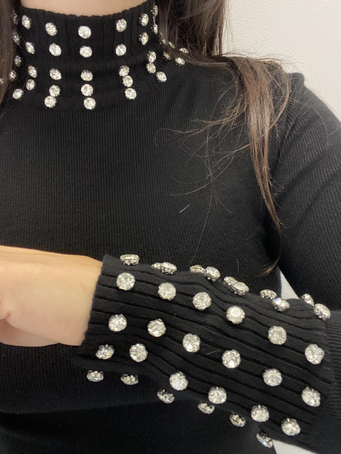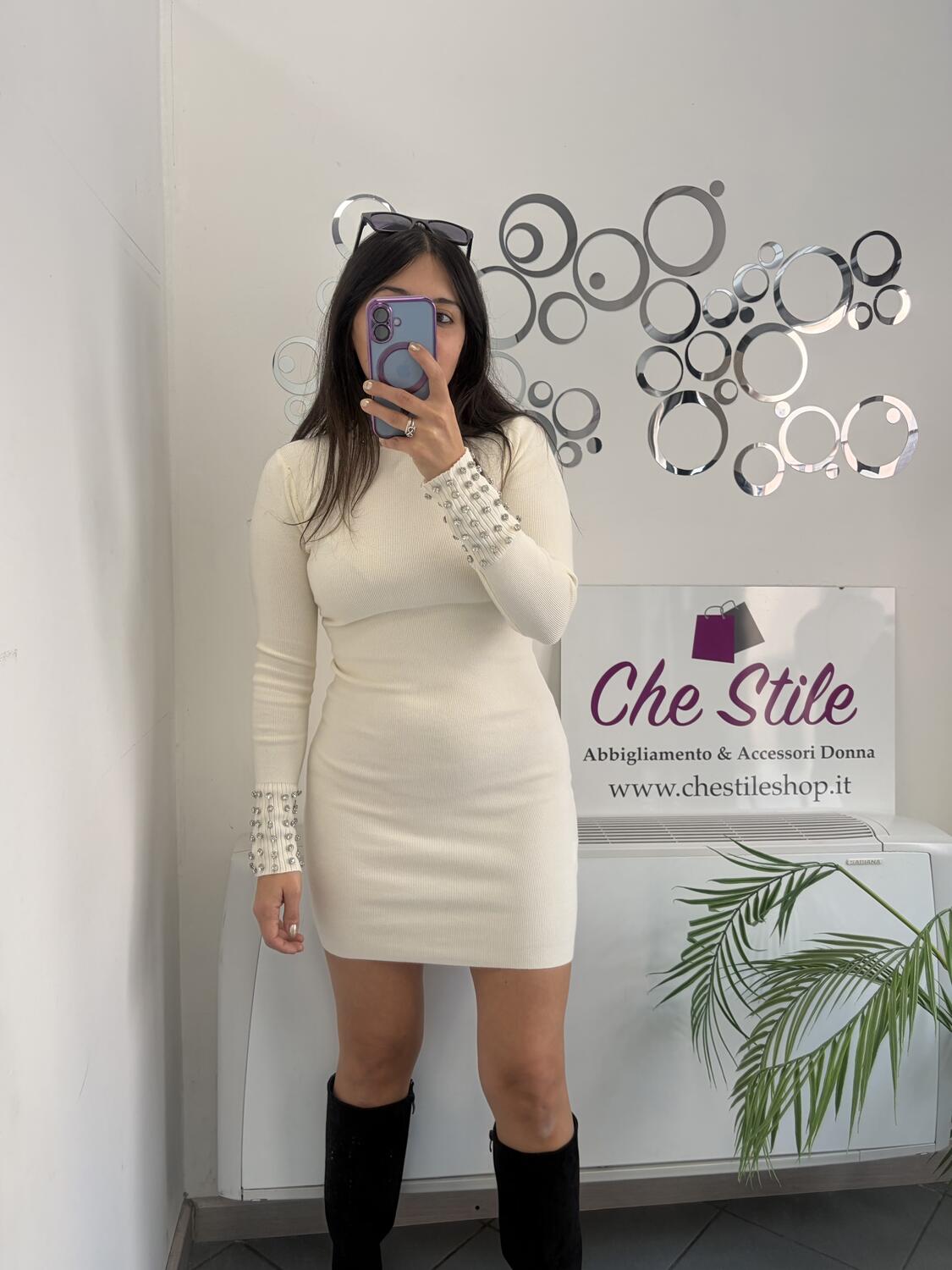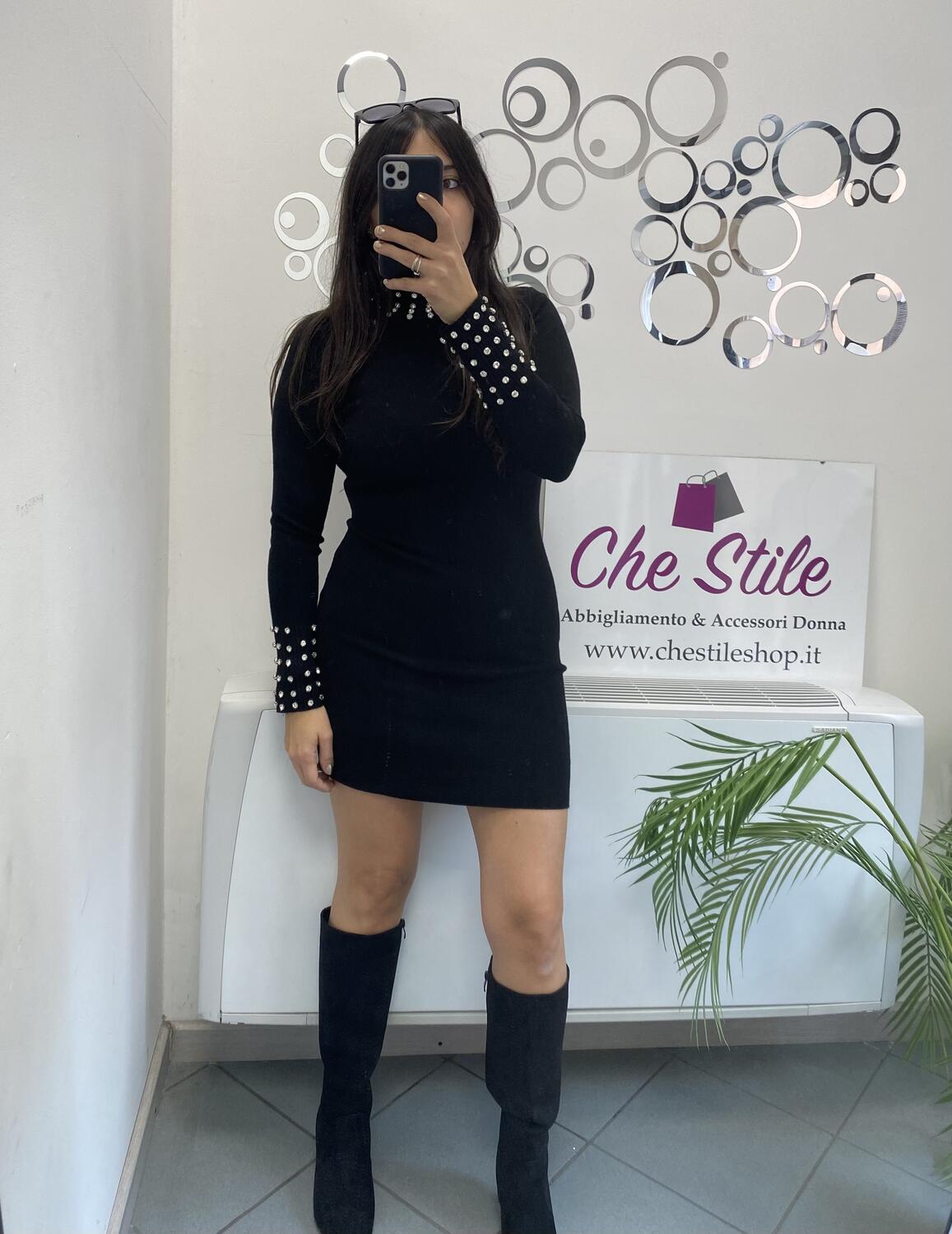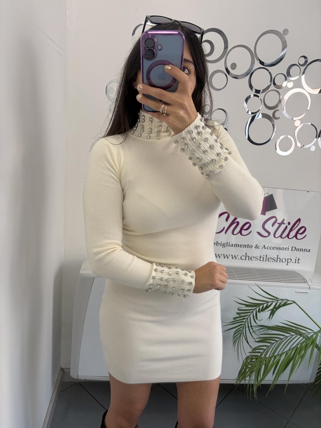 Abito in maglina di viscosa a costine sottili con mezzo collo e dettaglio di strass sui polsi e sul collo. Taglia unica, veste dalla 38 alla 44/46. Composizione: 88% viscosa, 12% nylon.