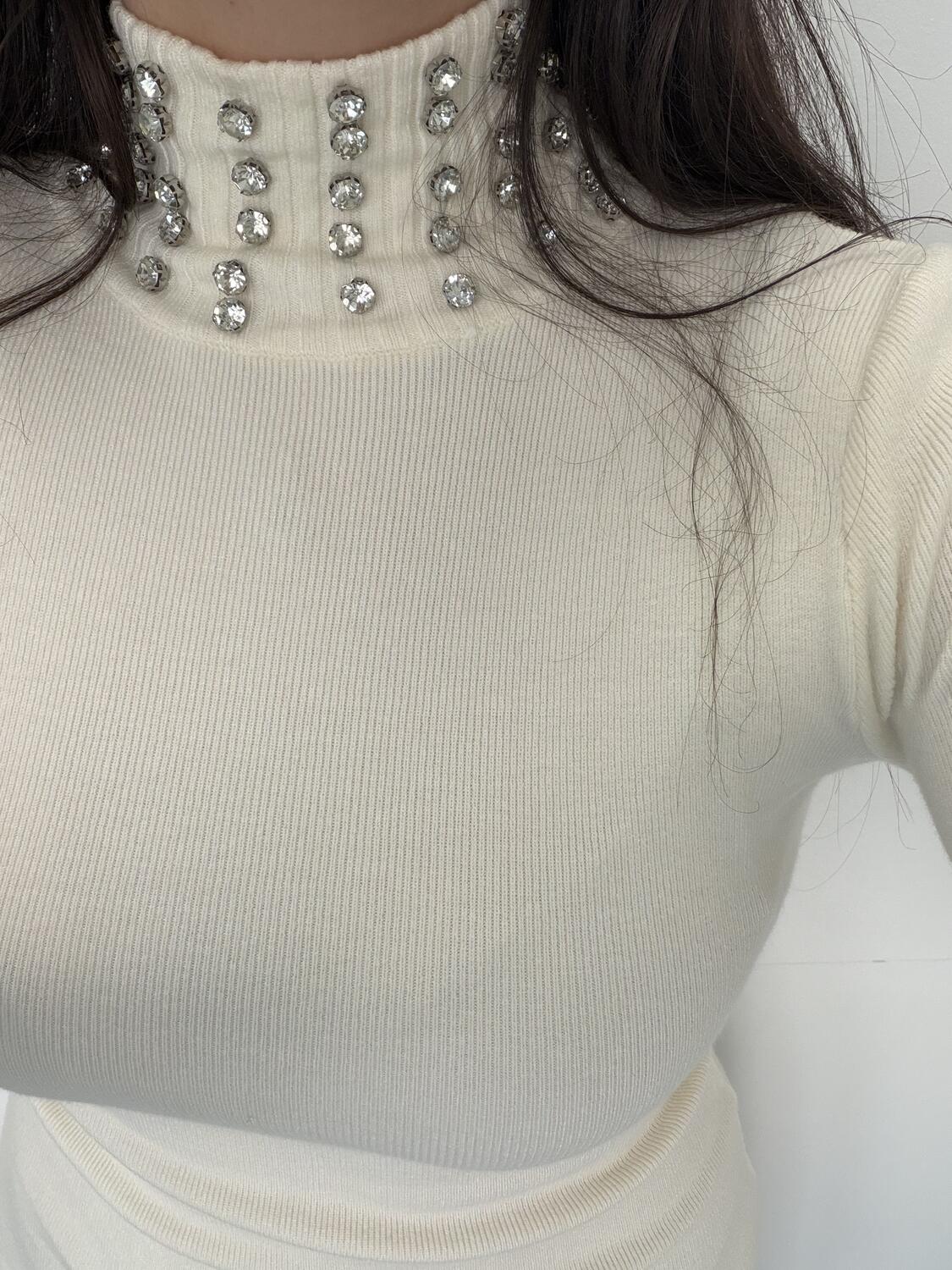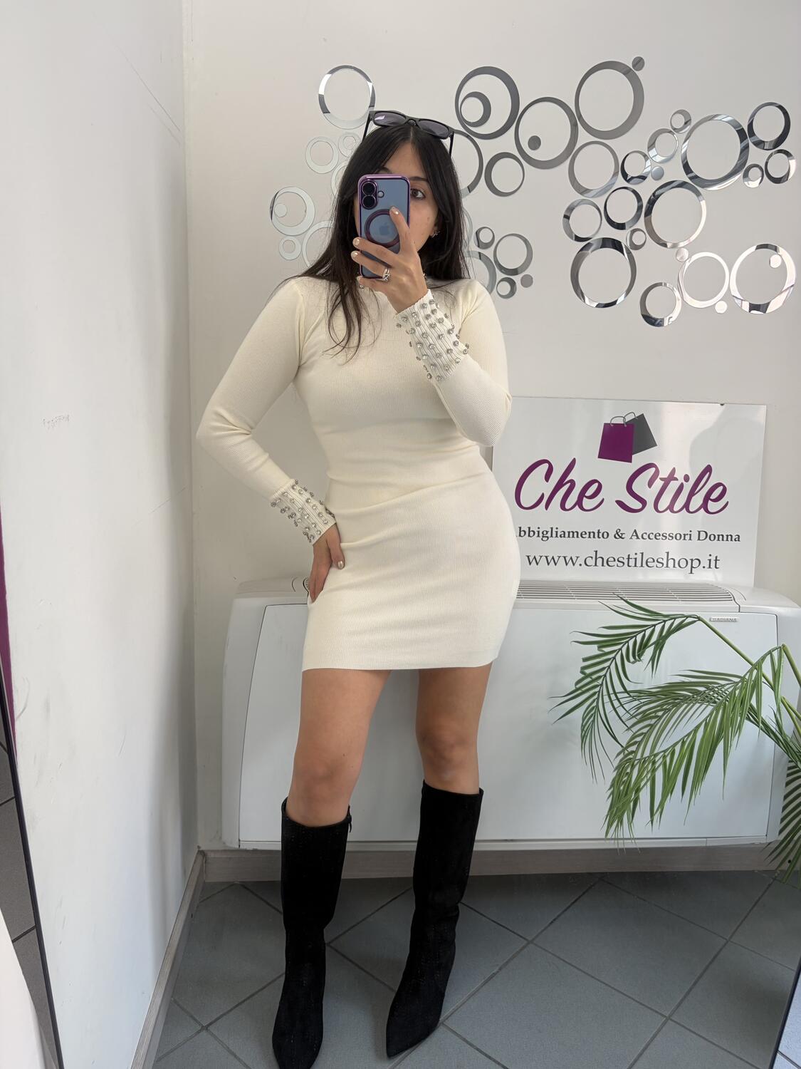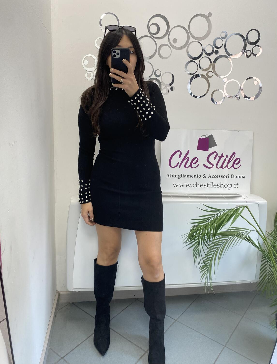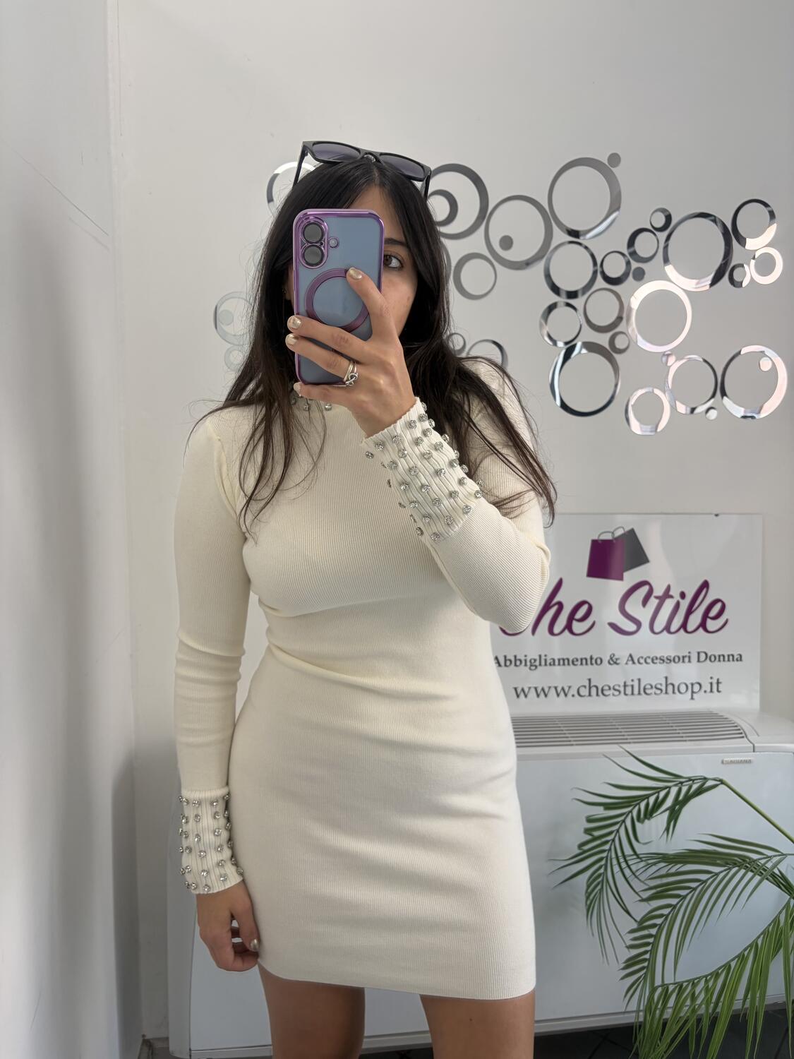 Abito in maglina di viscosa a costine sottili con mezzo collo e dettaglio di strass sui polsi e sul collo. Taglia unica, veste dalla 38 alla 44/46. Composizione: 88% viscosa, 12% nylon.