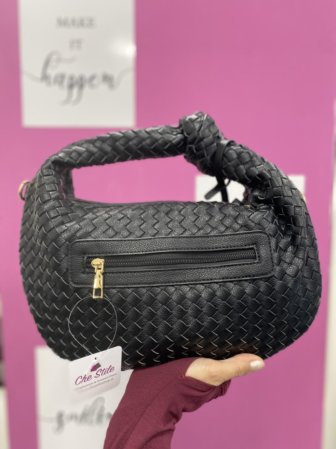Borsa morbida a mano con trama intrecciata. Tracolla in dotazione. Chiusura con zip.