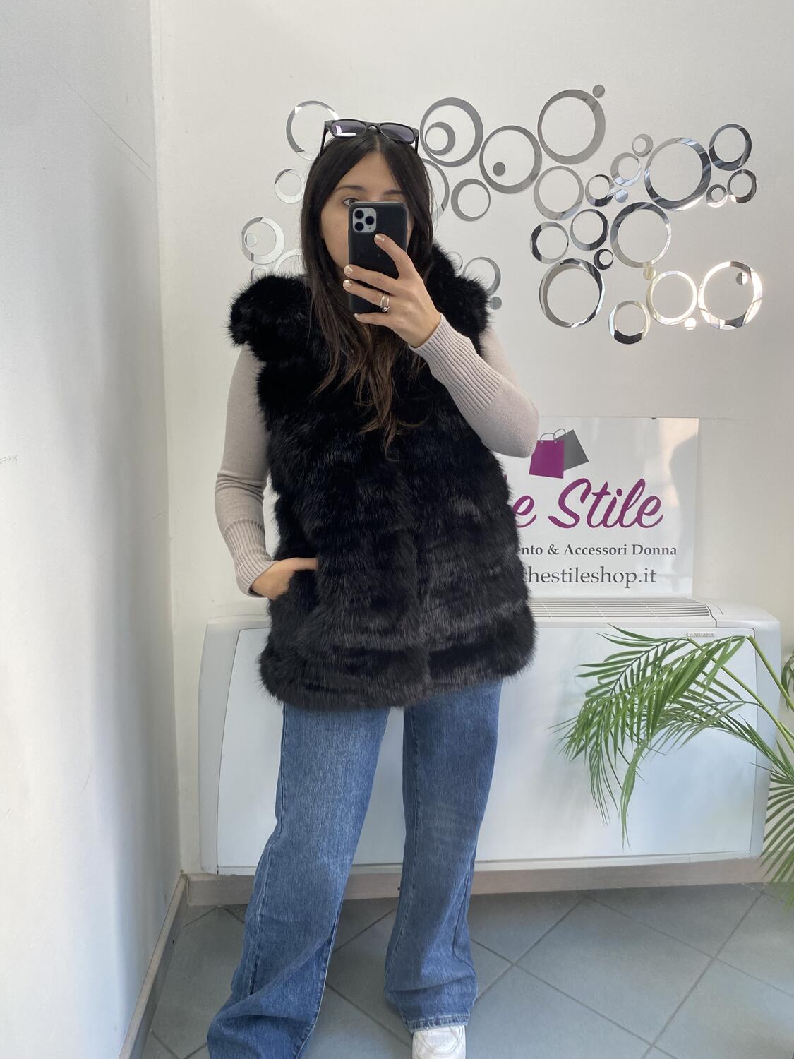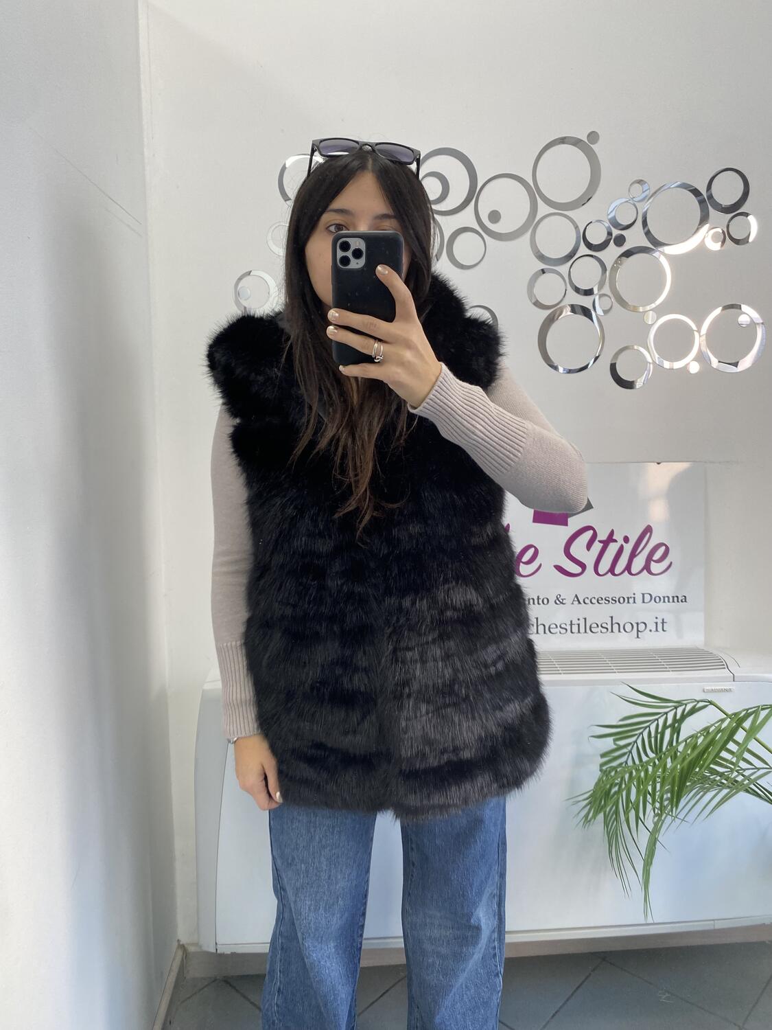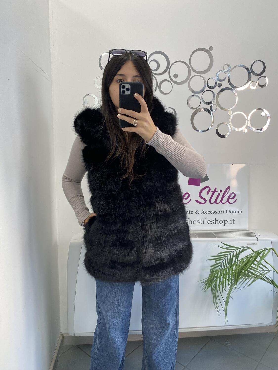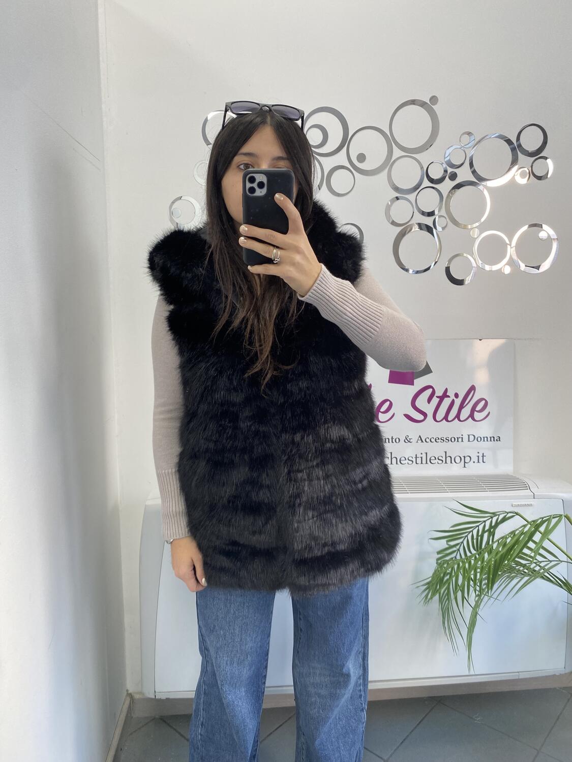 Eco pelliccia smanicata con cappuccio e tasche. Chiusura con gancini invisibili; foderata internamente. Taglia unica, veste dalla 38 alla 46. Made in Italy. Composizione: 100% poliestere.
