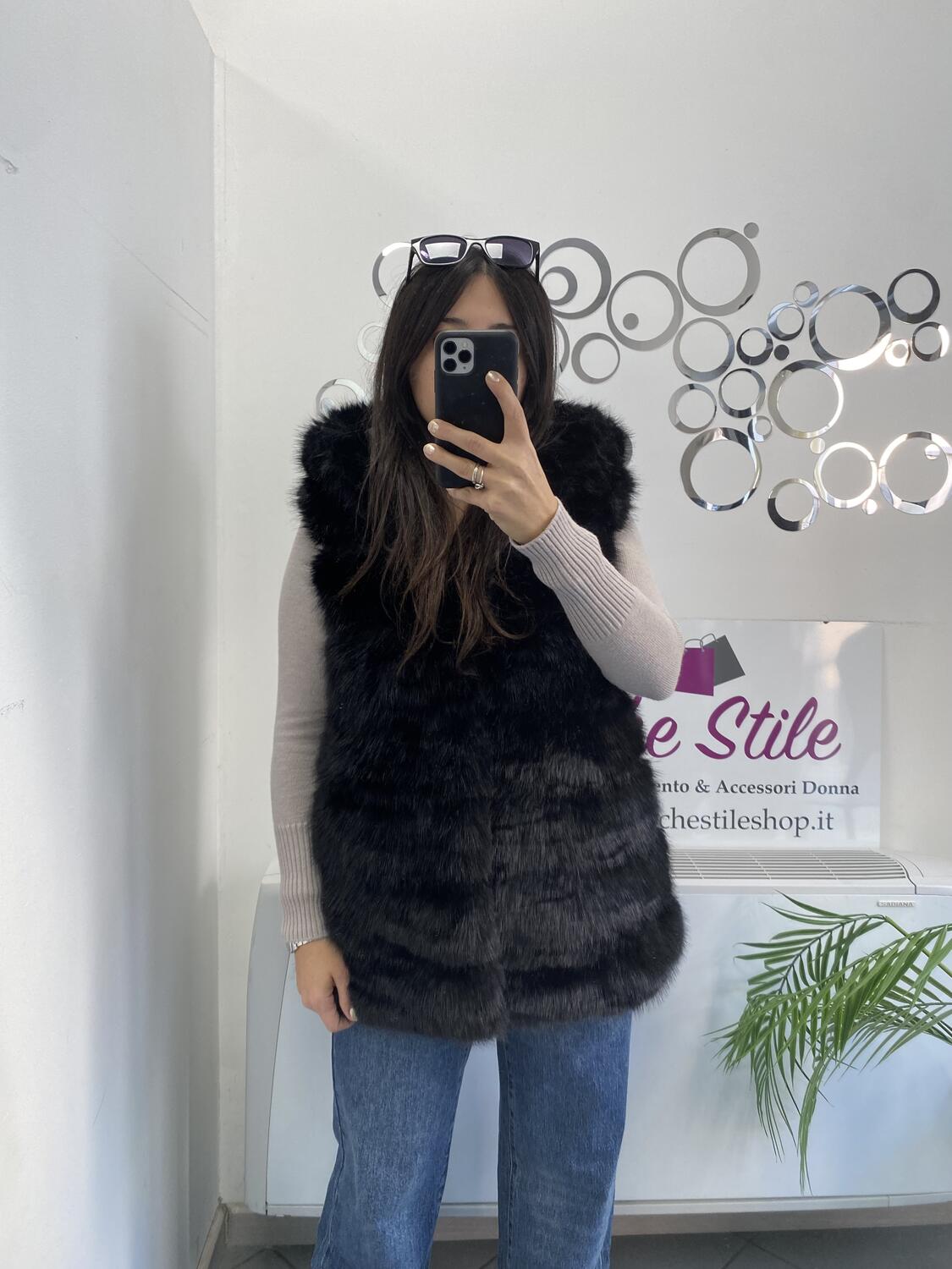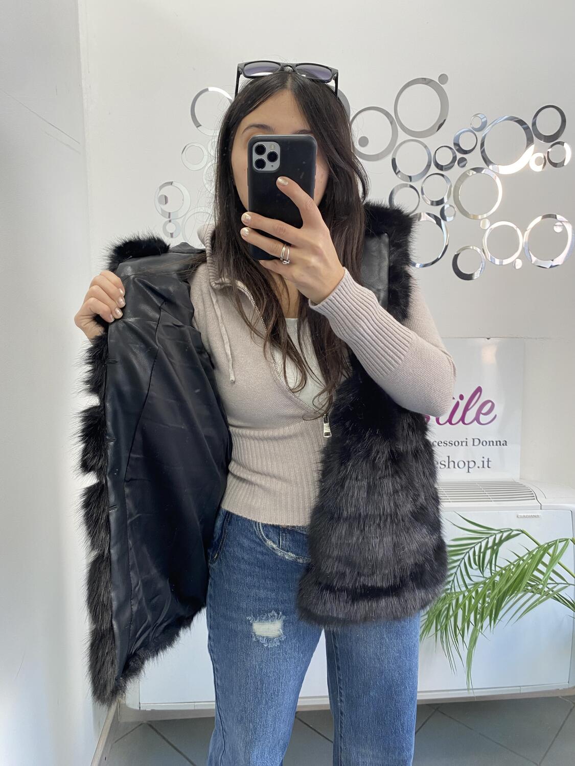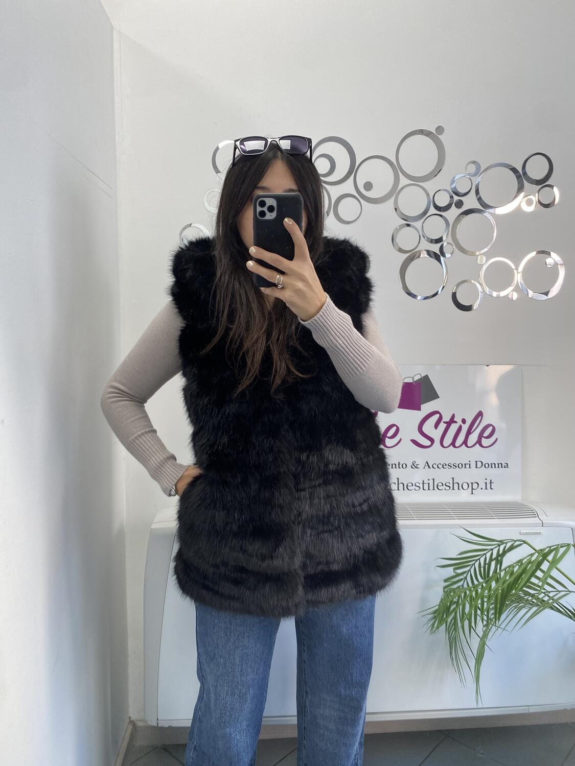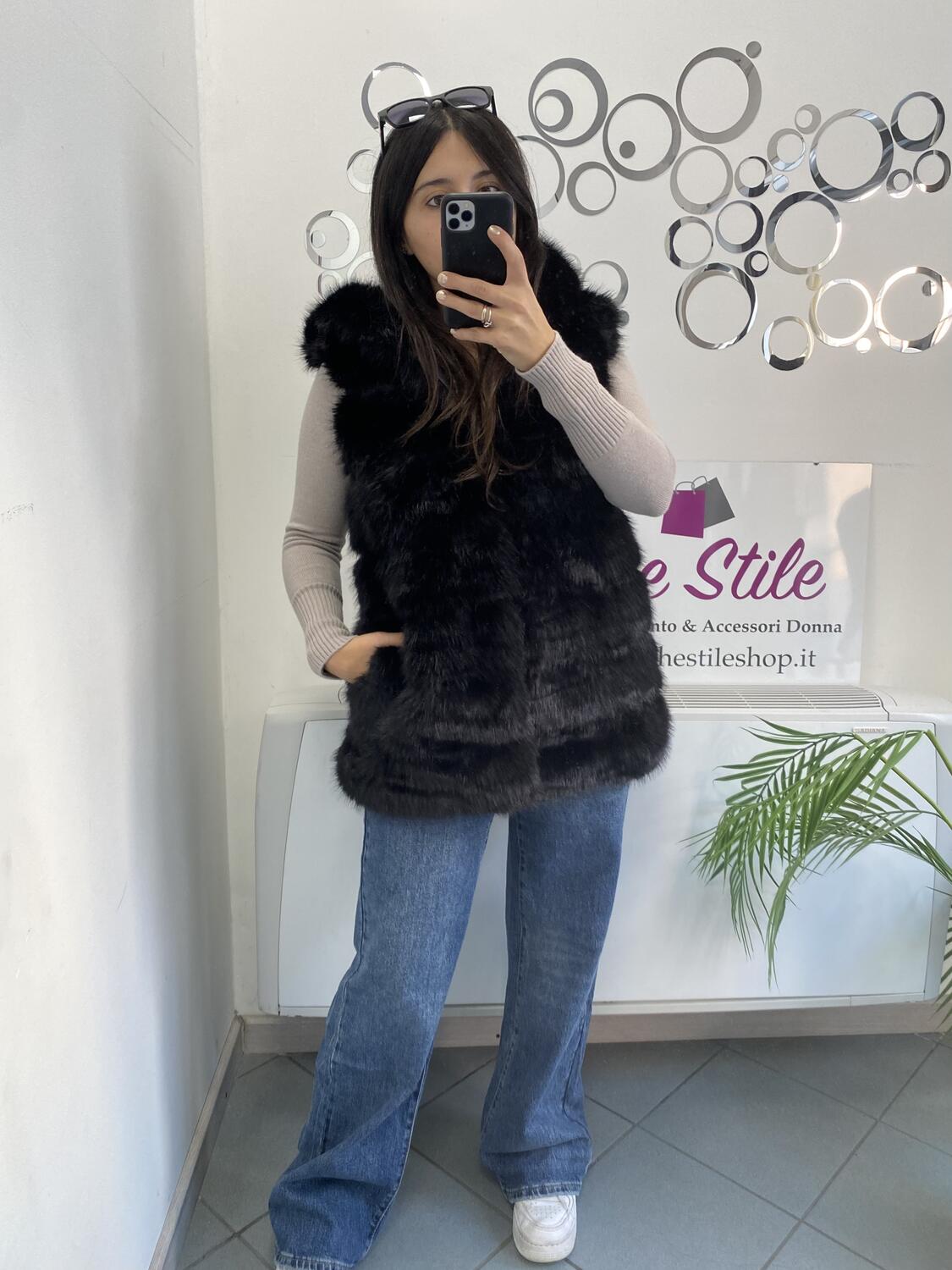 Eco pelliccia smanicata con cappuccio e tasche. Chiusura con gancini invisibili; foderata internamente. Taglia unica, veste dalla 38 alla 46. Made in Italy. Composizione: 100% poliestere.