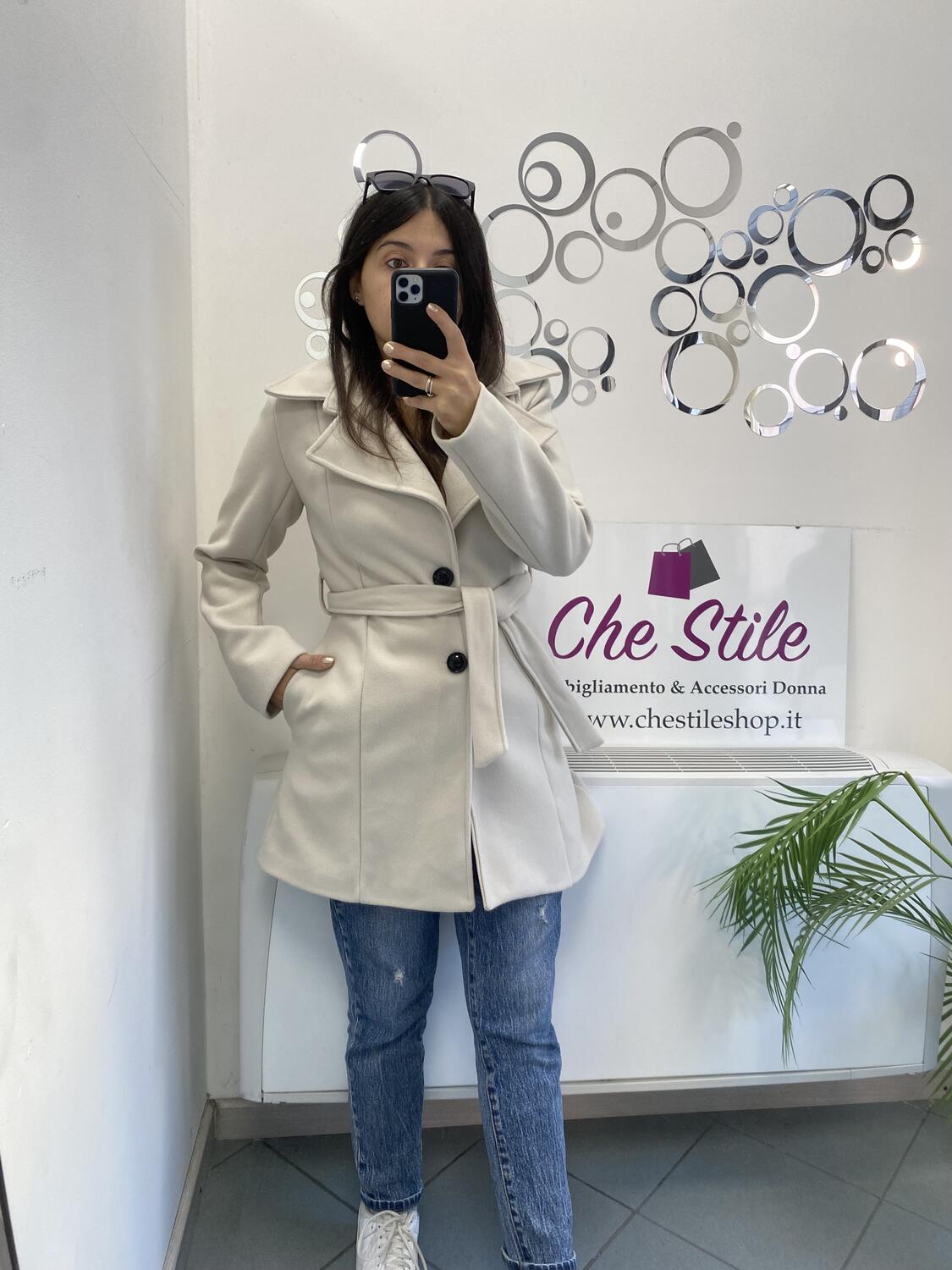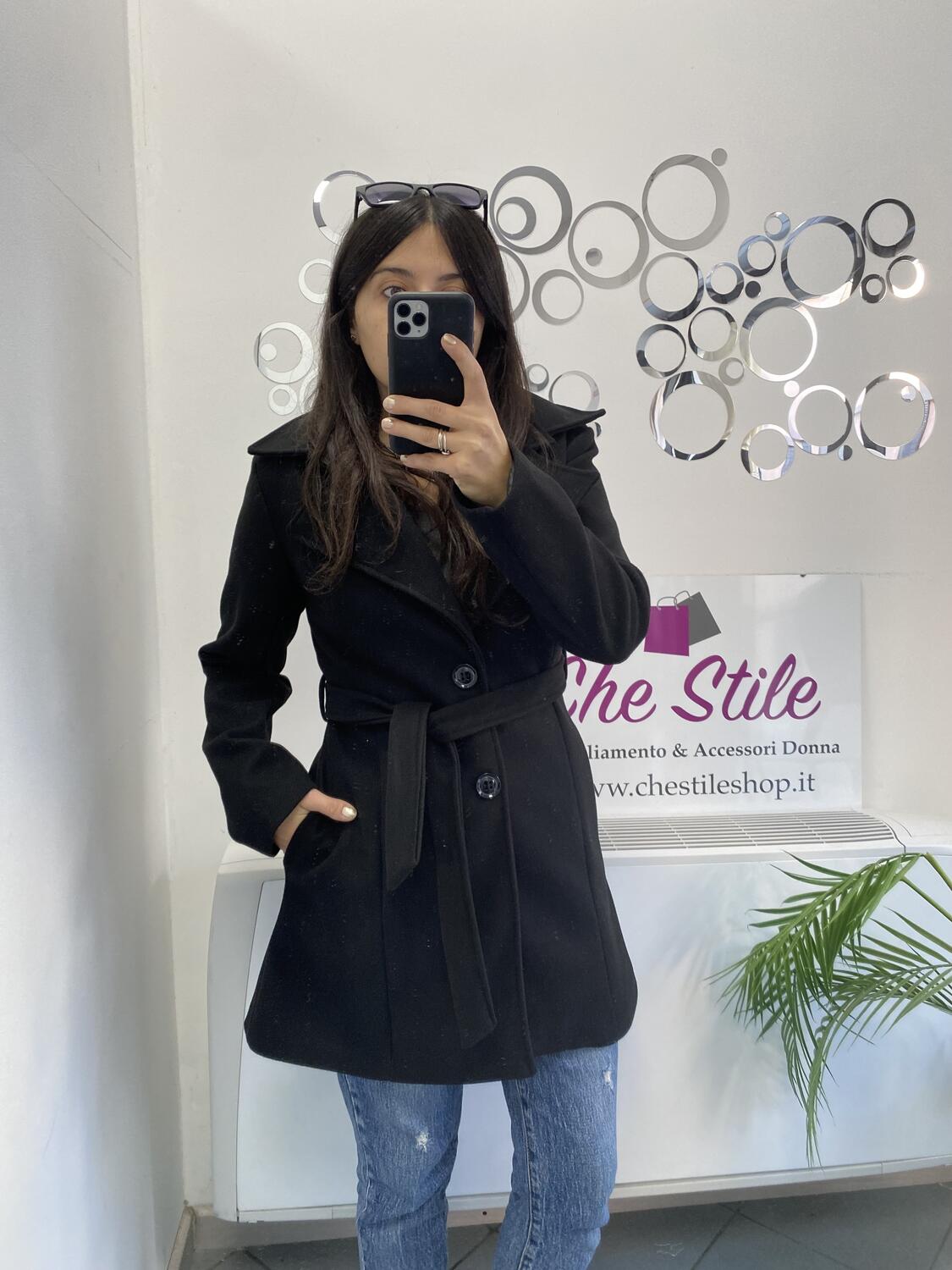 Cappotto media lunghezza foderato internamente, con spalline imbottite, tasche, chiusura con due bottoni e cintura. Disponibile in taglia S-M-L. Vestibilità piccola, si consiglia una taglia in più. Composizione: 97% poliestere, 3% elastan.