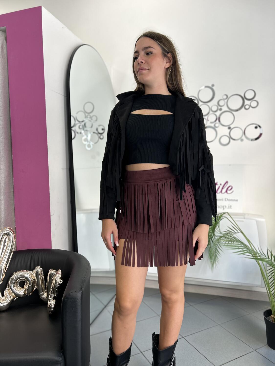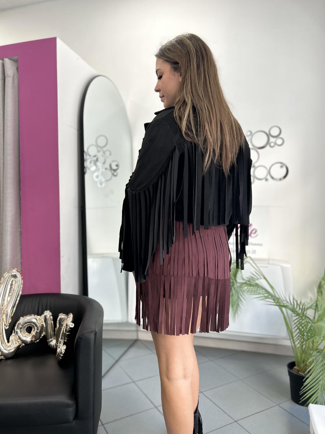 Giacca scamosciata con frange (NO chiusura, NO spalline). Taglia unica, veste dalla 38 alla 44. Made in Italy. Composizione: 95% poliestere, 5% elastan.