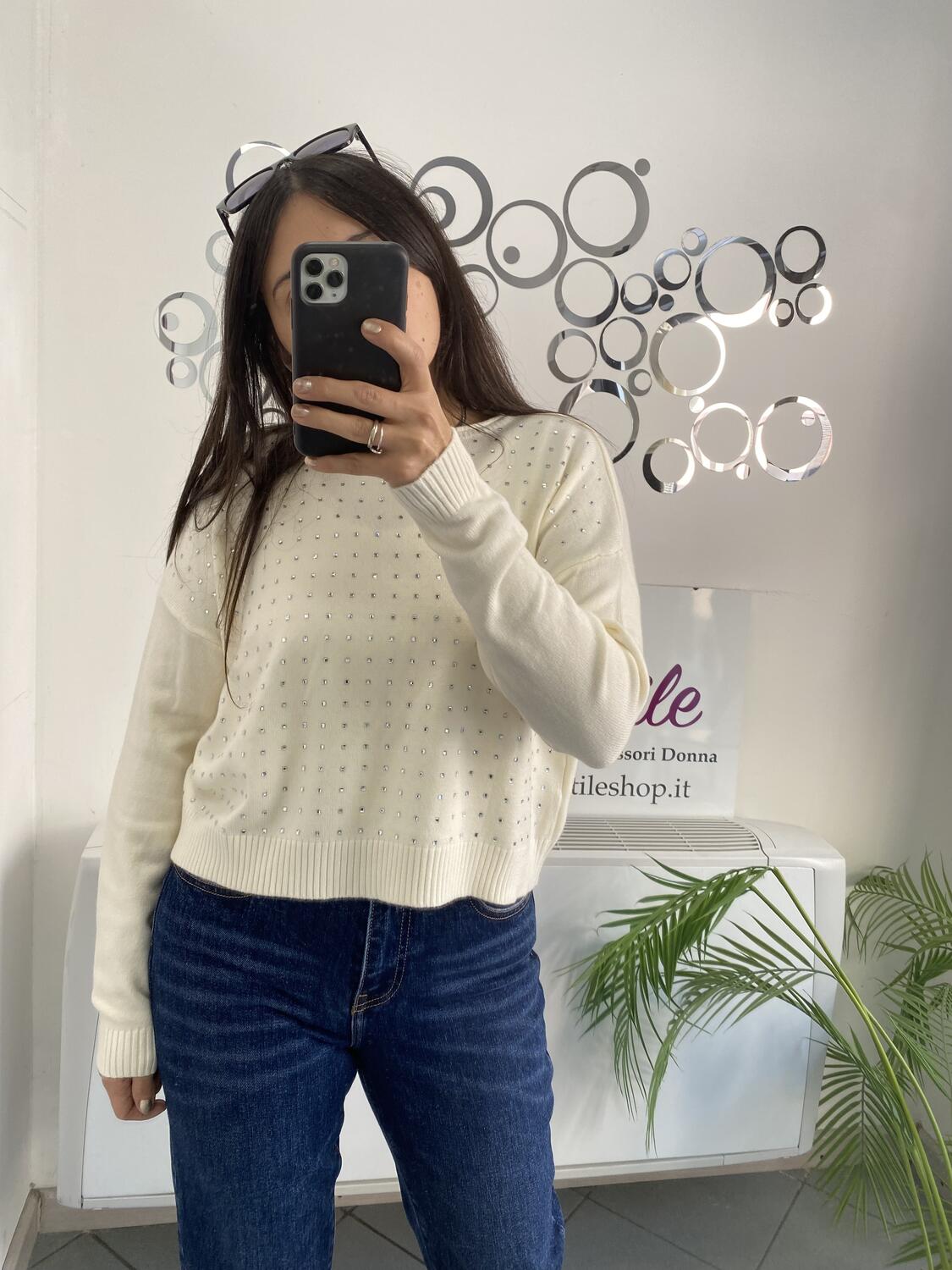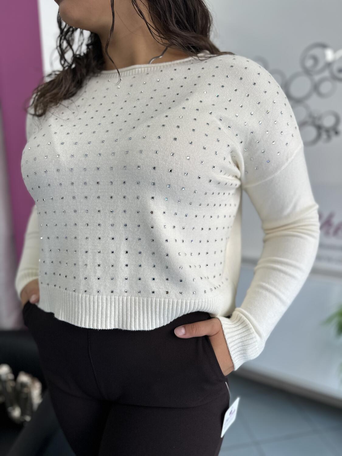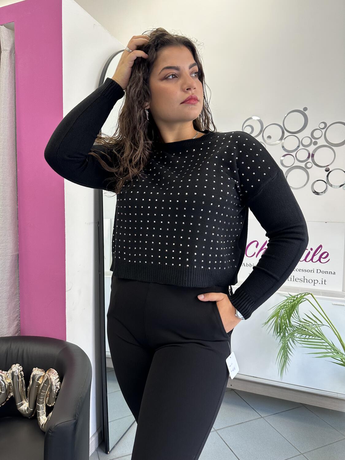 Pull girocollo in viscosa modello morbido a scatoletta con brillantini (solo frontali). Taglia unica, veste dalla 38 alla 46. Made in Italy. Composizione: 88% viscosa, 12% nylon.