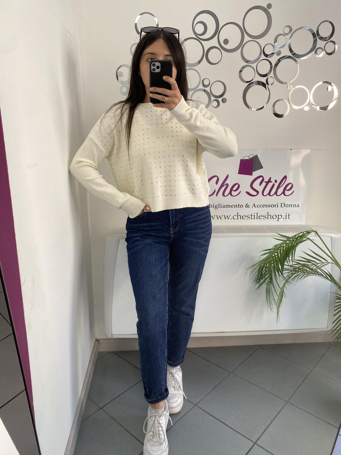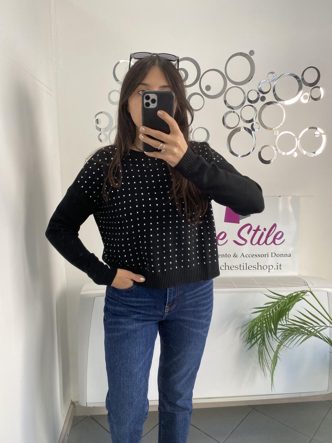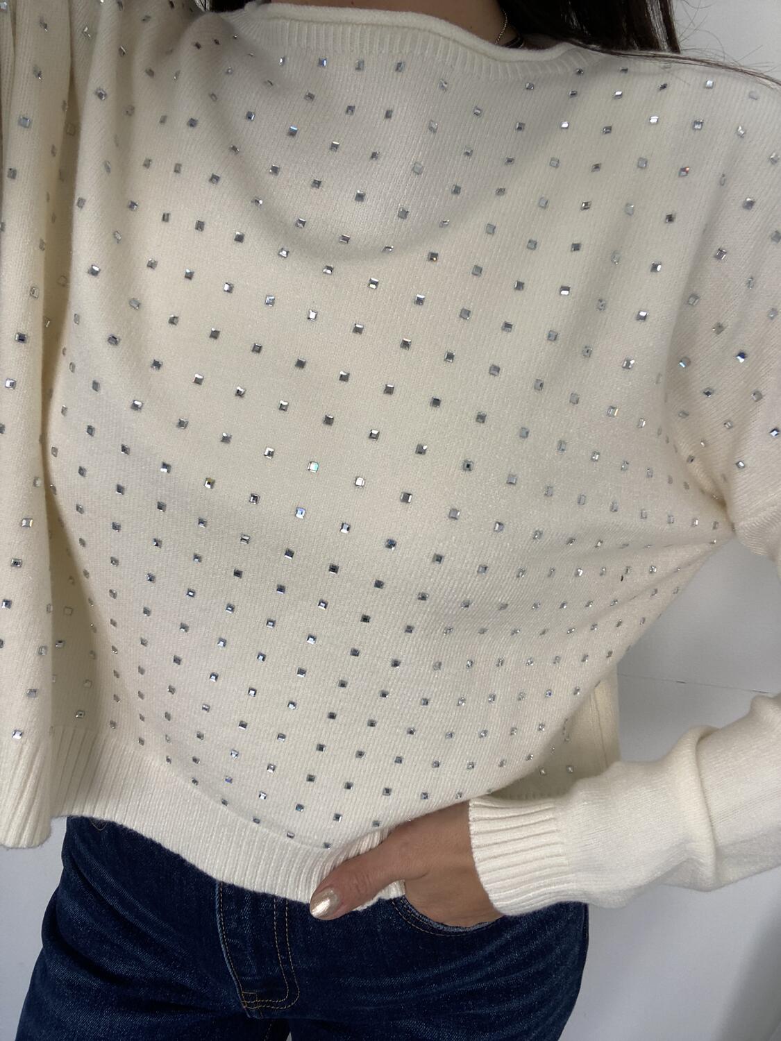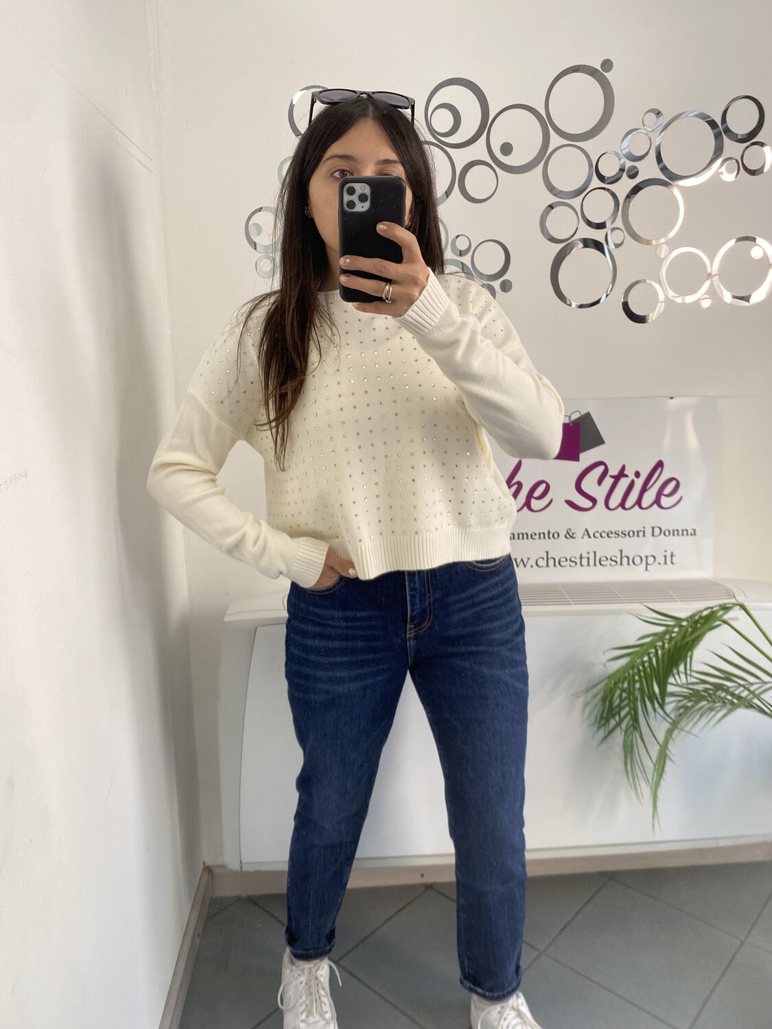 Pull girocollo in viscosa modello morbido a scatoletta con brillantini (solo frontali). Taglia unica, veste dalla 38 alla 46. Made in Italy. Composizione: 88% viscosa, 12% nylon.