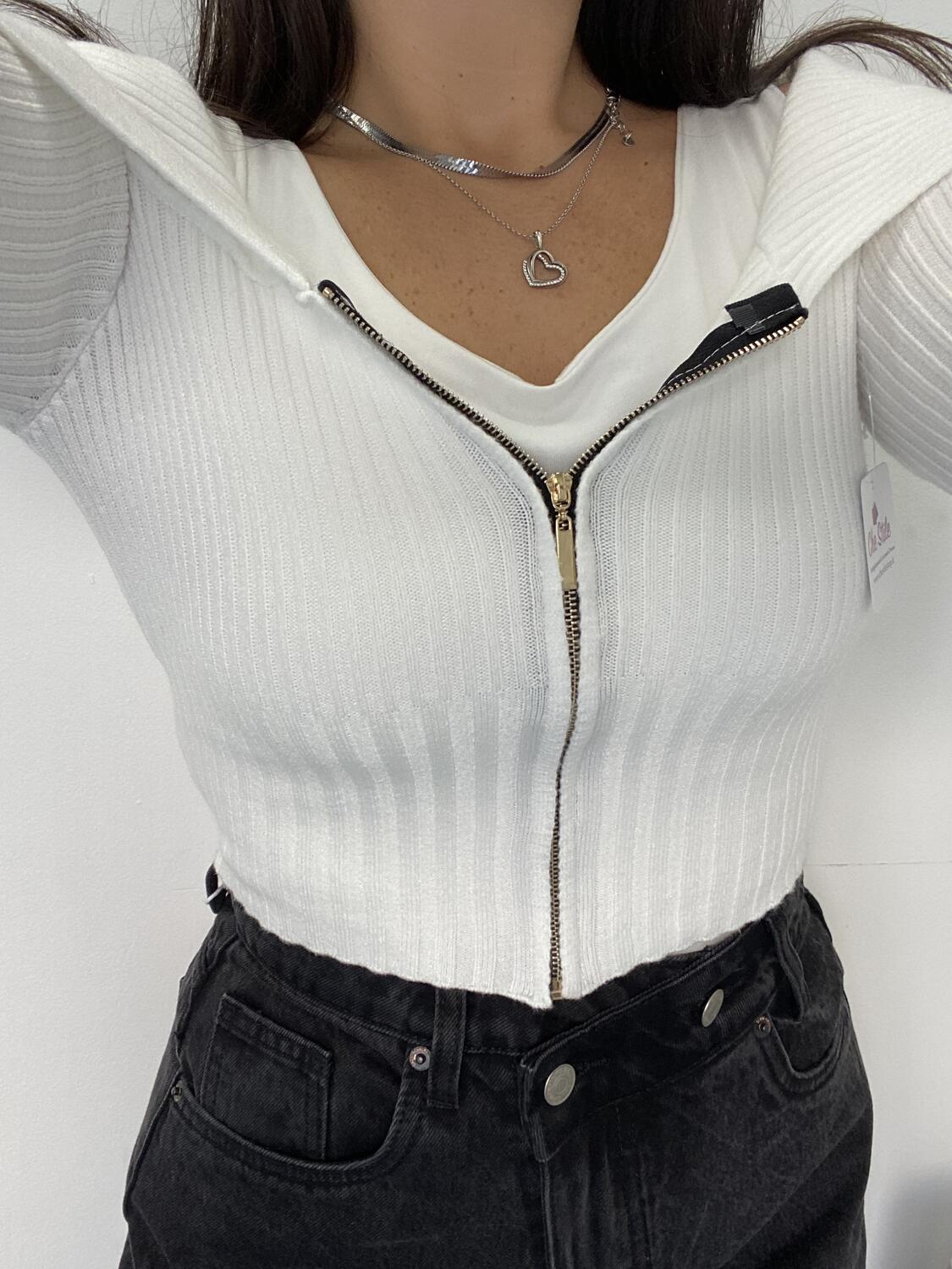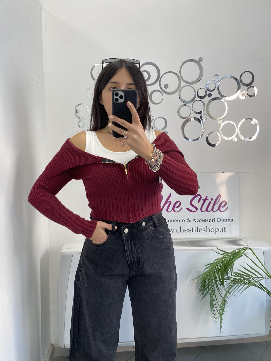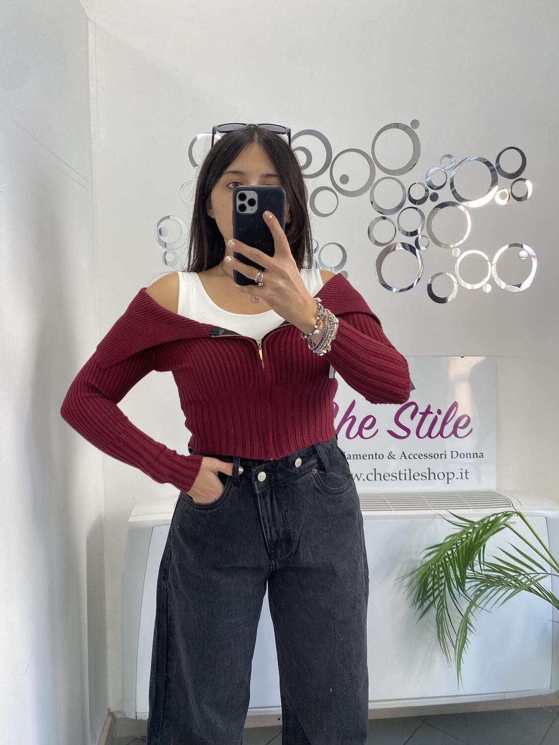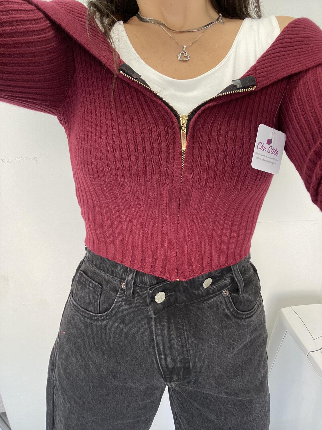 Pull crop a costine in misto viscosa con zip lunga e risvolto sulle spalle (portabile anche con un body sotto, come in foto). Taglia unica, veste dalla 38 alla 44. Composizione: 51% viscosa, 24% nylon, 25% poliammide.