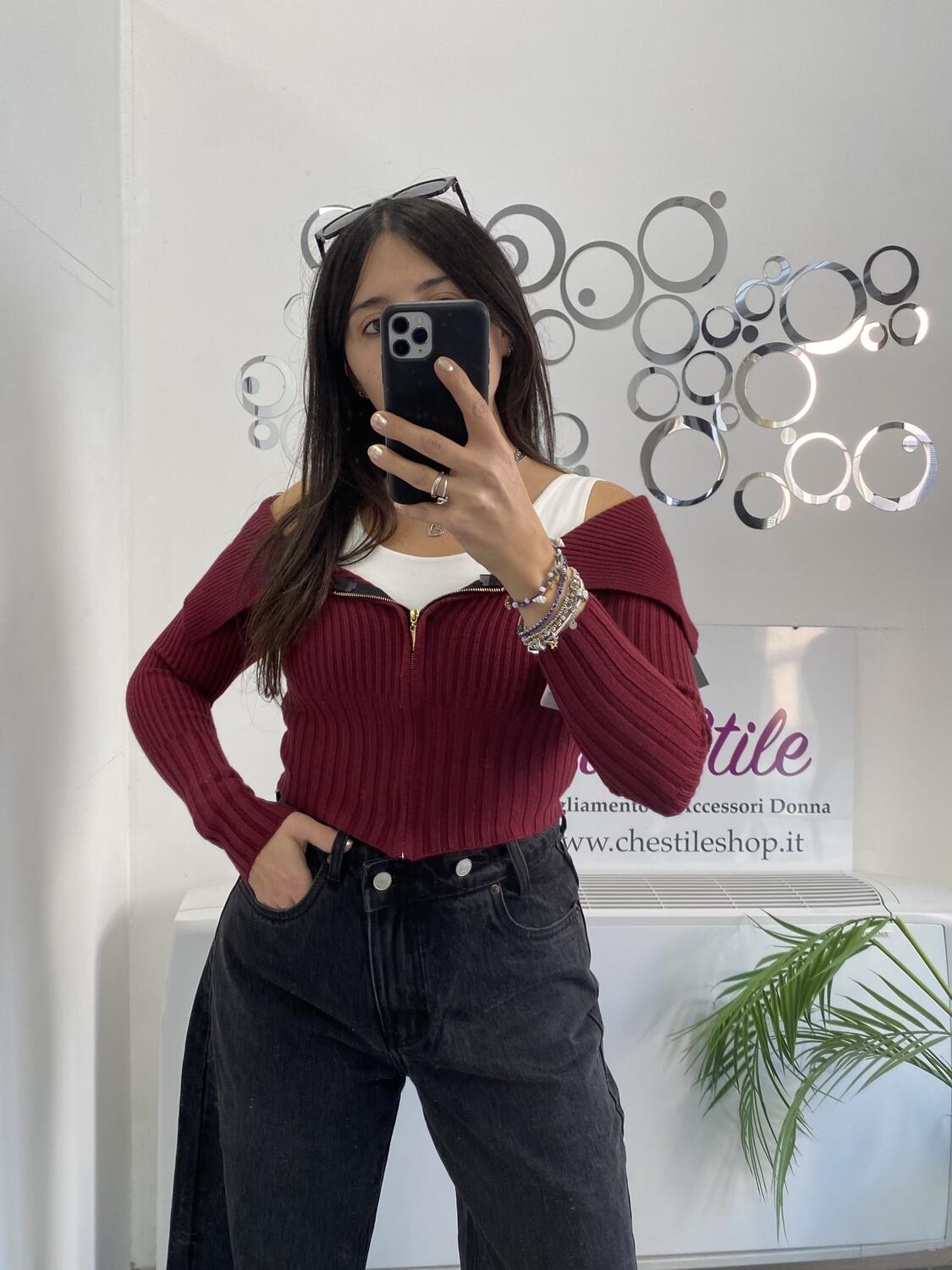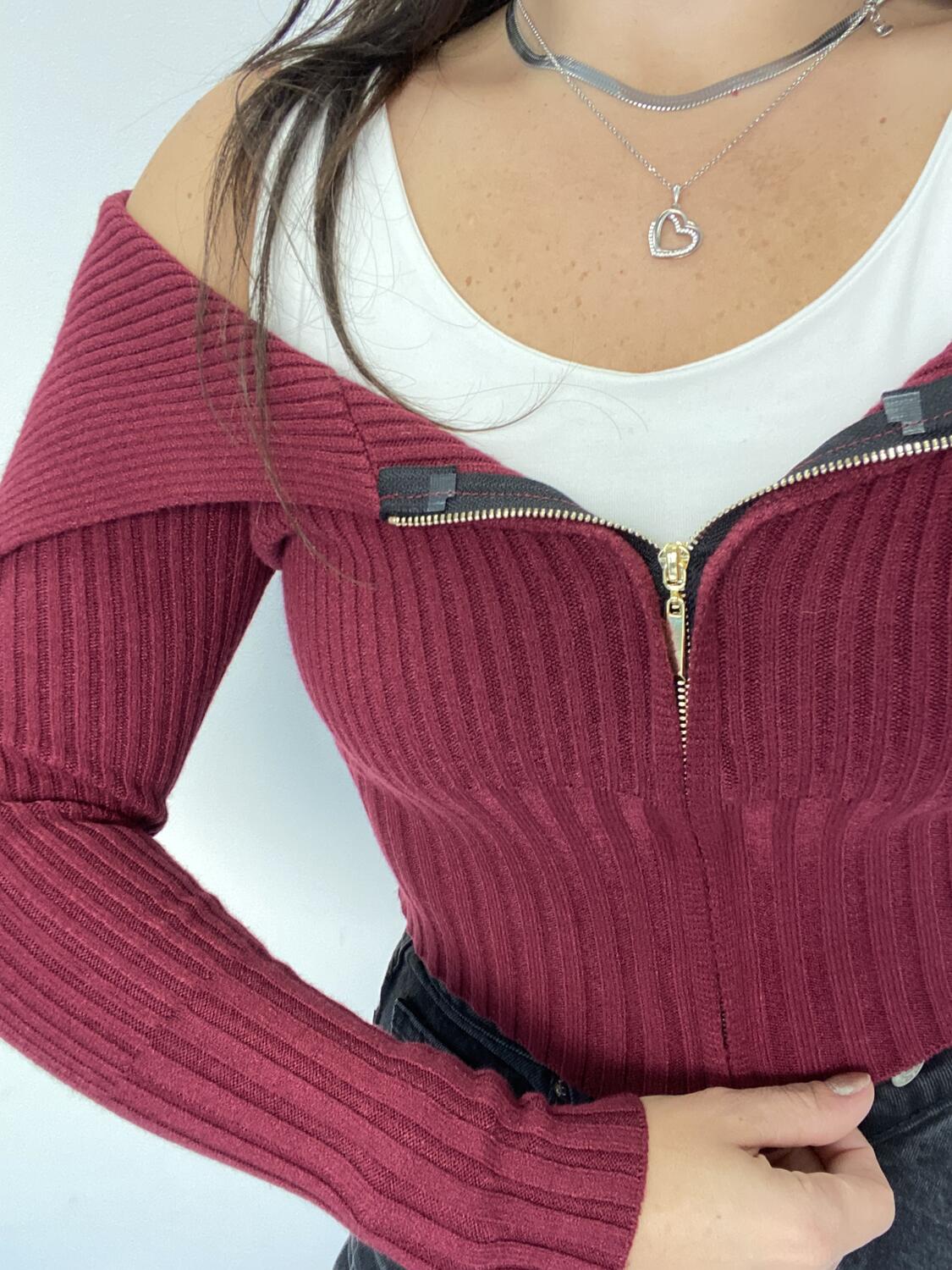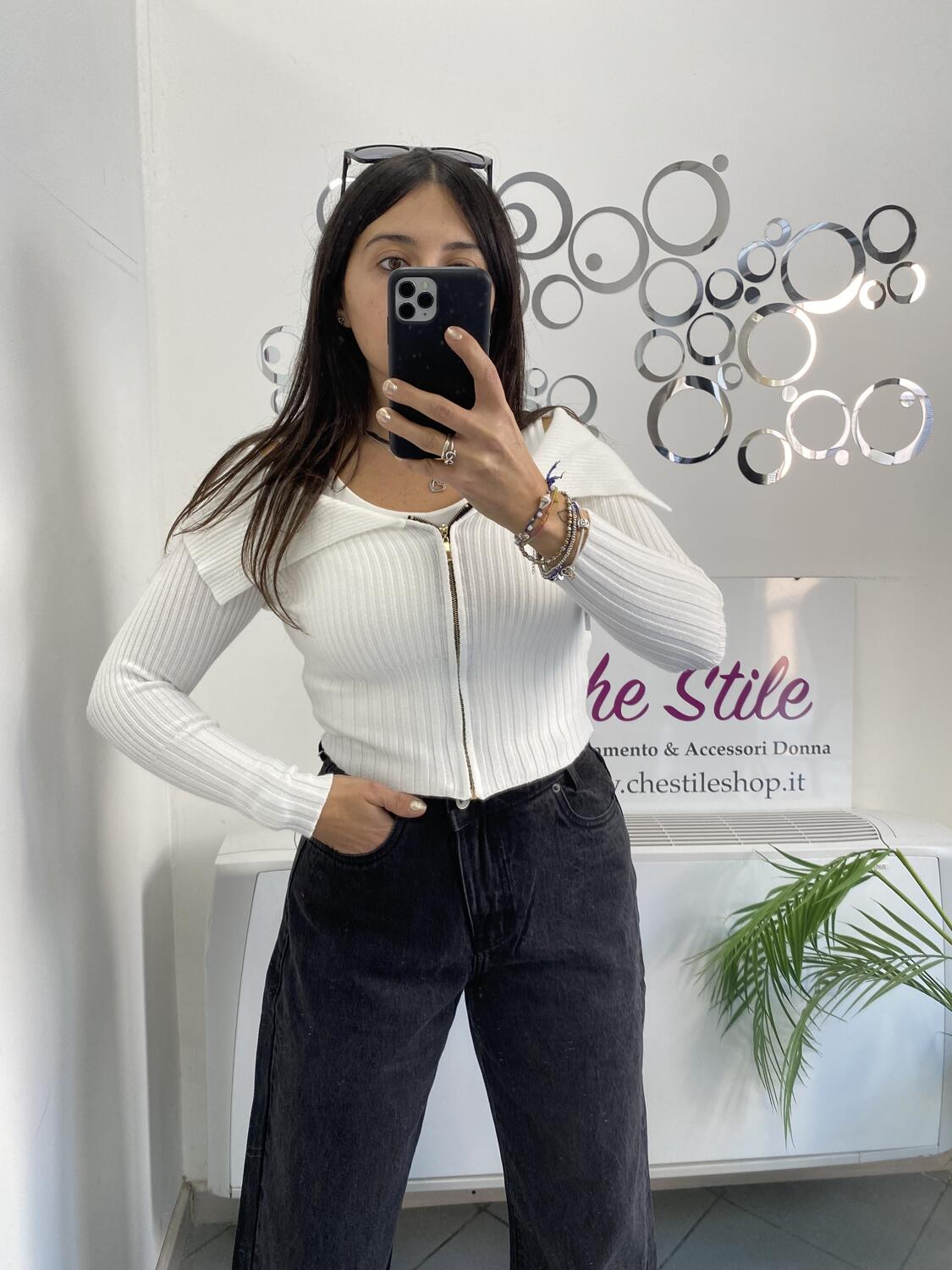 Pull crop a costine in misto viscosa con zip lunga e risvolto sulle spalle (portabile anche con un body sotto, come in foto). Taglia unica, veste dalla 38 alla 44. Composizione: 51% viscosa, 24% nylon, 25% poliammide.