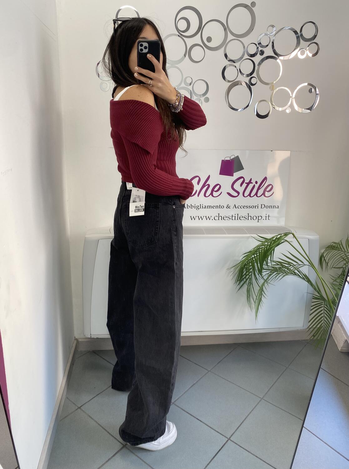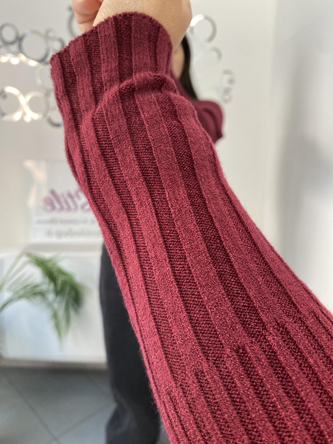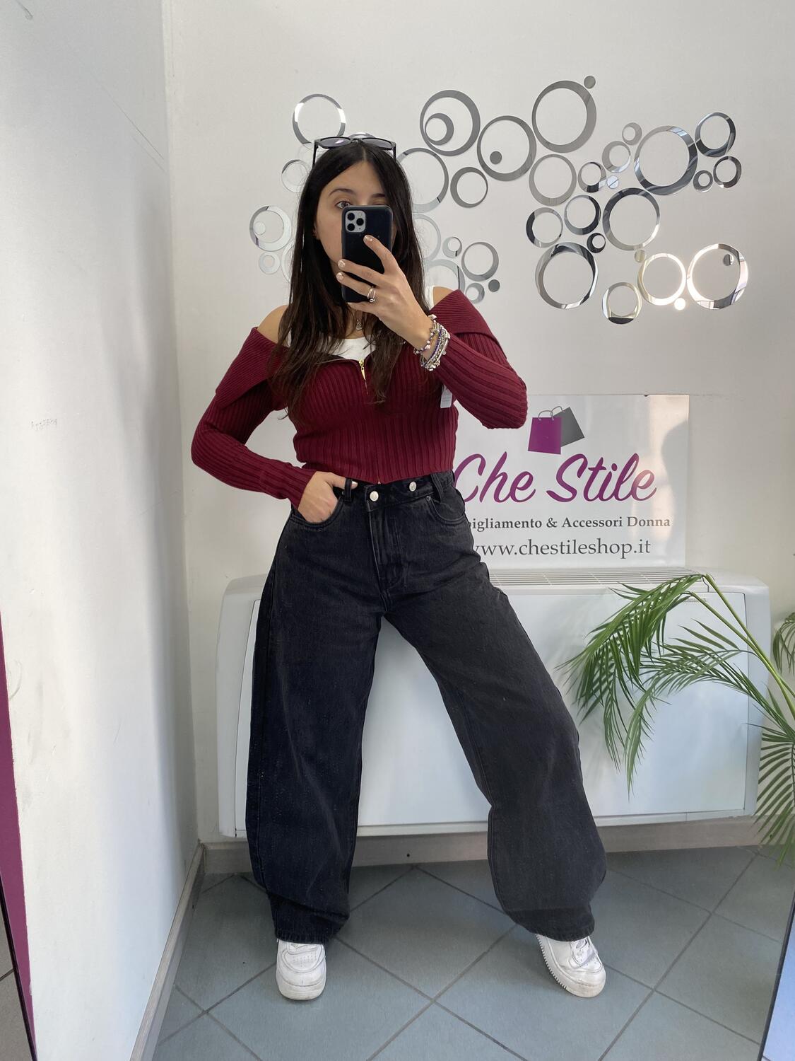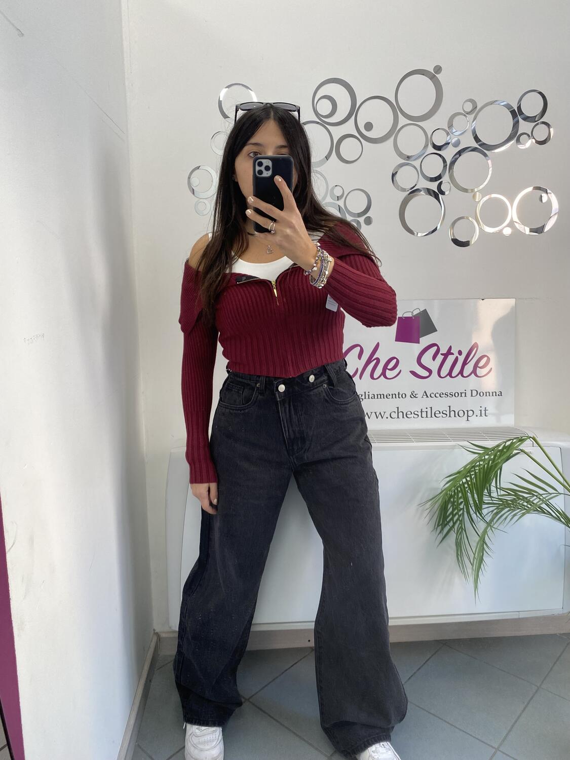 Pull crop a costine in misto viscosa con zip lunga e risvolto sulle spalle (portabile anche con un body sotto, come in foto). Taglia unica, veste dalla 38 alla 44. Composizione: 51% viscosa, 24% nylon, 25% poliammide.