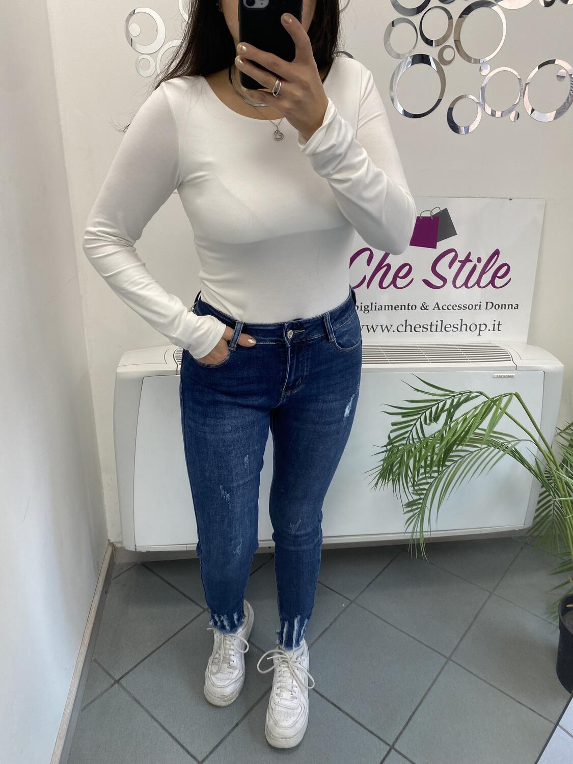 Jeans skinny push up elasticizzato con taglio vivo sul fondo e strappetti. VIta media. Disponibile dalla XS (38) alla XL (46/48). Composizione: 63% cotone, 32% poliestere, 2% viscosa, 3% elastan.