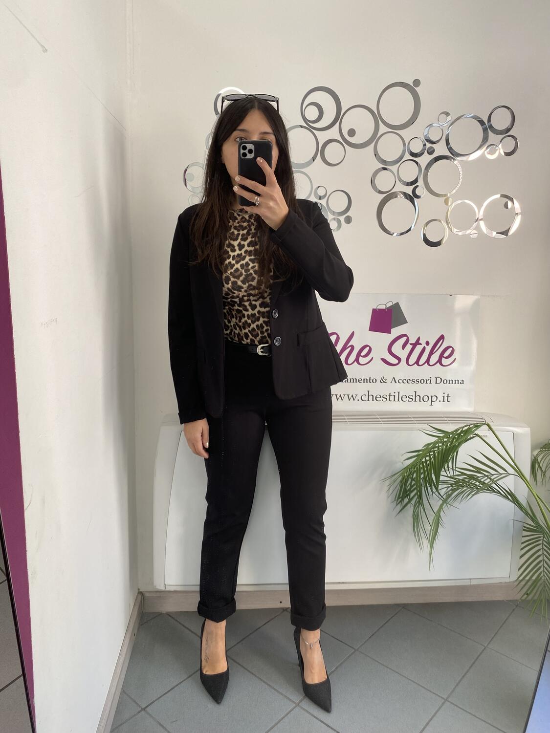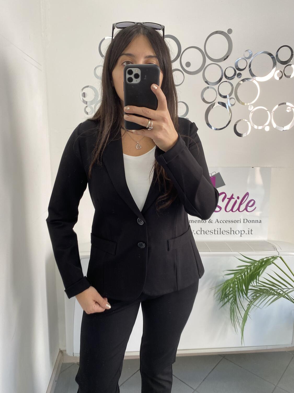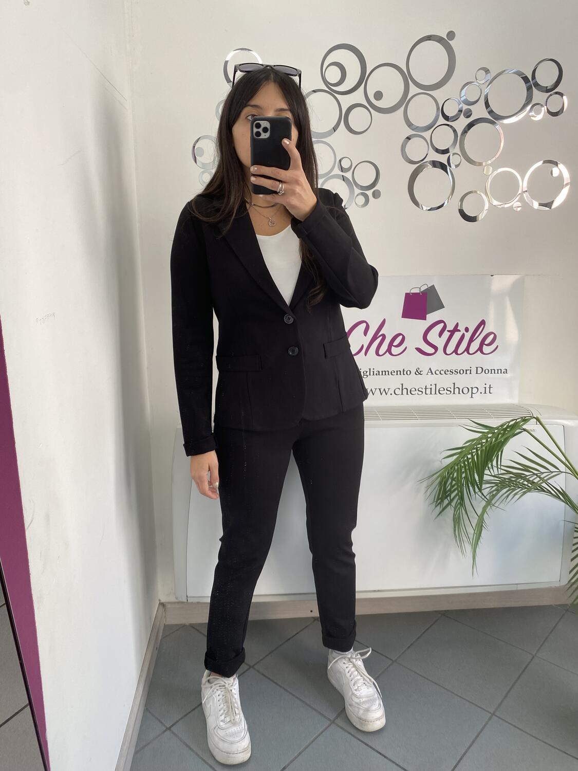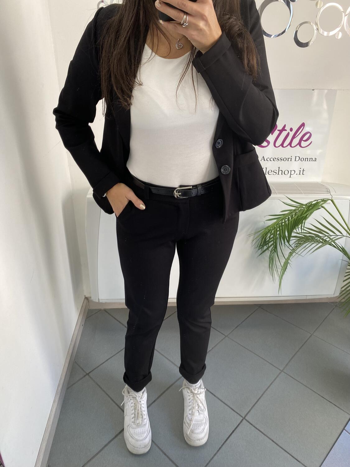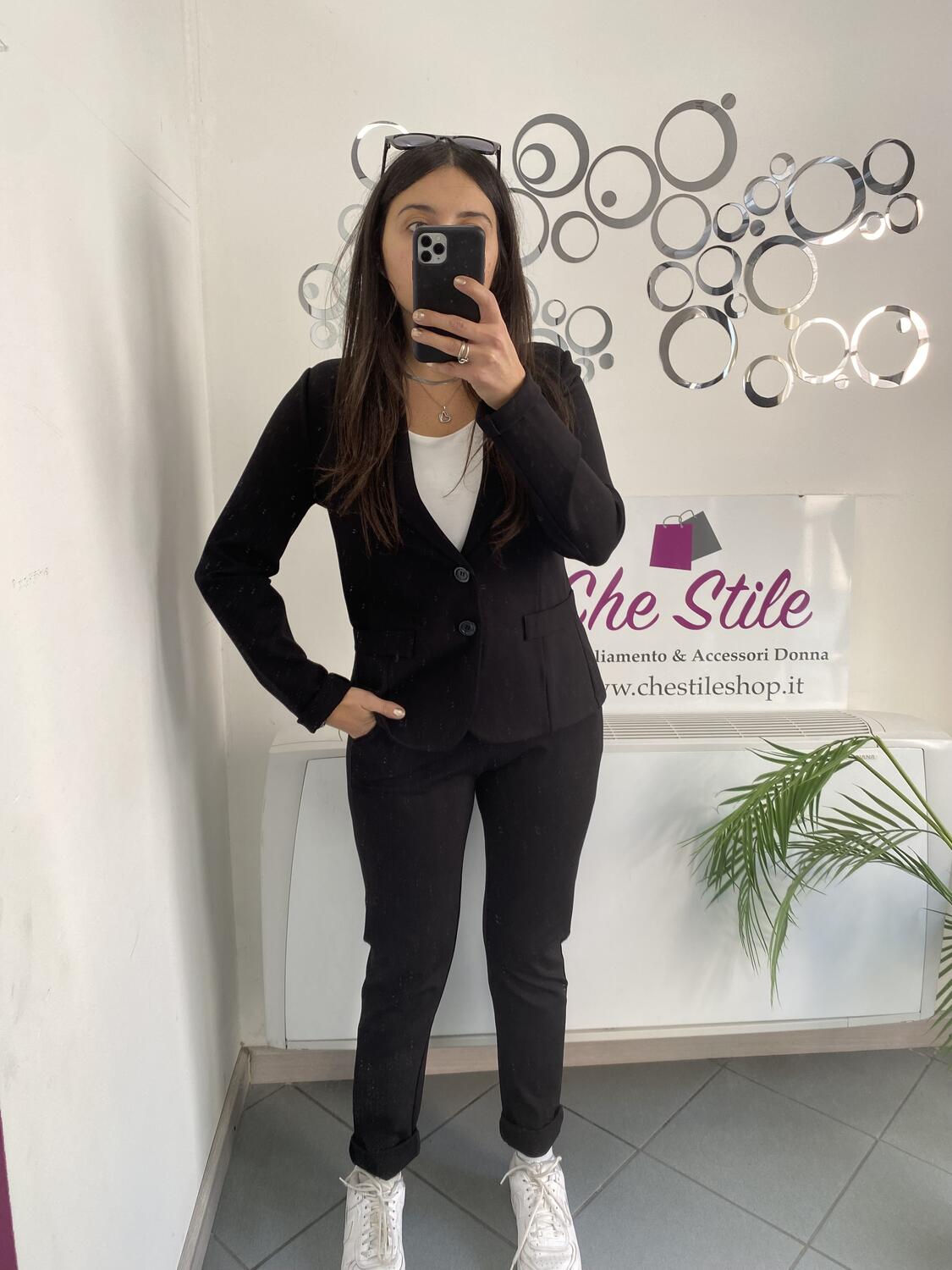 Completo elasticizzato composto da giacca sciancrata con chiusura con due bottoni e pantalone a sigaretta con tasche e cinturina. Disponibile dalla S (38/40) alla XL (46). Made in Italy. Composizione: 65% viscosa, 32% nylon, 3% elastan.